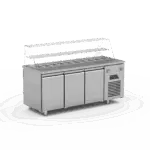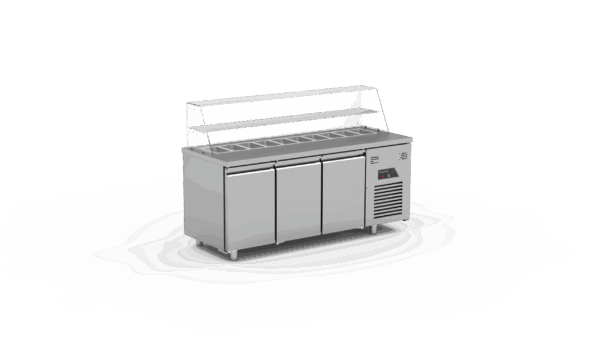 Das Modell UGR-185-SLD-GL kühlt zwischen –2°C und +8°C. Die Maße betragen 185×70×85/135 cm. Es hat ein Fassungsvermögen von 400 Litern. Die Isolationsstärke beträgt 50 mm. Der Stromverbrauch liegt bei 0,32 kW und die Spannung bei 220V–50Hz. Dieses Modell ist mit einer Glasabdeckung, einem Servieraufsatz und einem Schutzgeländer ausgestattet, was es besonders für den Einsatz im Gastronomiebereich macht.